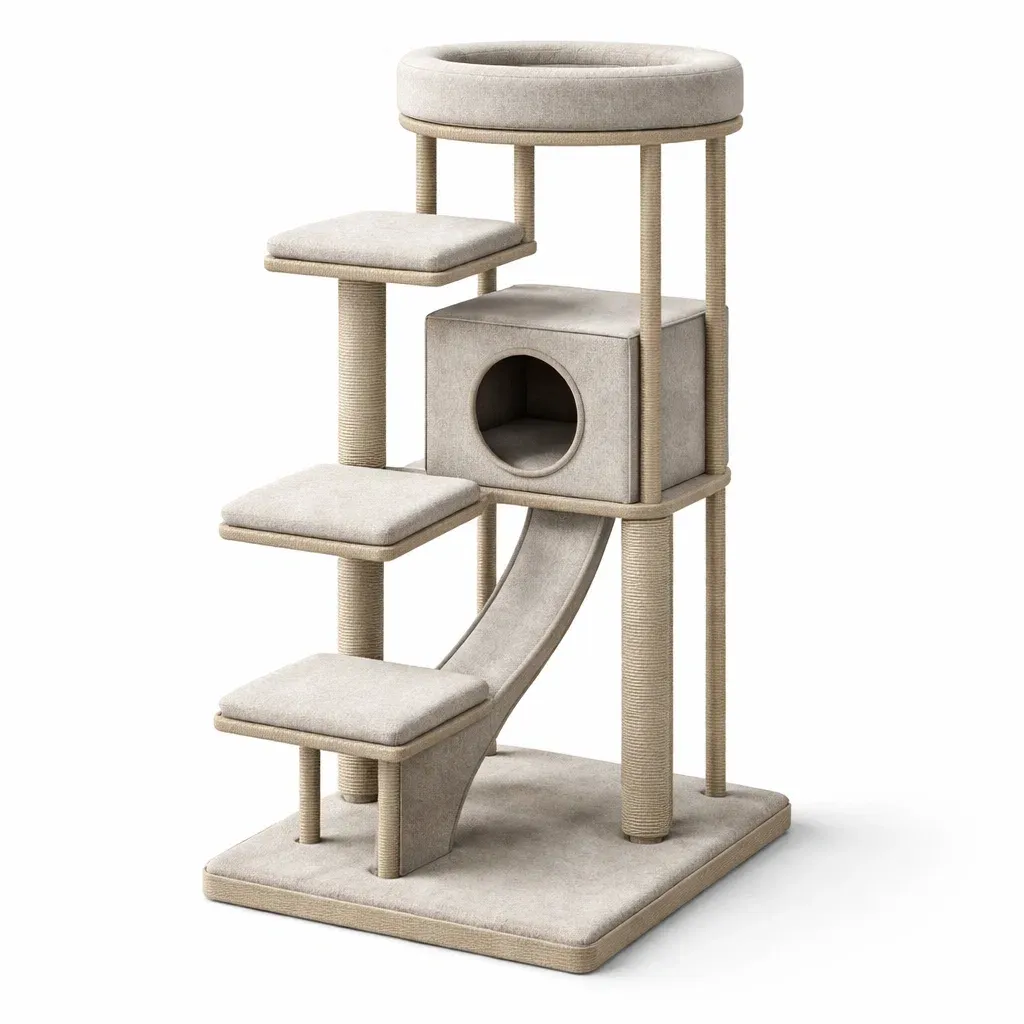 Funzioni: 4 livelli con divano, piattaforme, casa cubo e scala arrampicata. Consigliato per gatti domestici di piccola e media taglia.