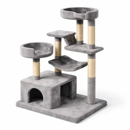 Composizione delle parti: piattaforma superiore, piattaforma centrale, casa in basso, pali tiragraffi, amaca. Adatto a gatti di tutte le razze e dimensioni. Utilizzare un panno umido per pulire le superfici e aspirare regolarmente. Posizionare lontano da fonti di calore diretto.