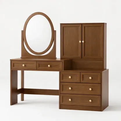 Toeletta con specchio ovale in legno marrone con vano e cassetti
